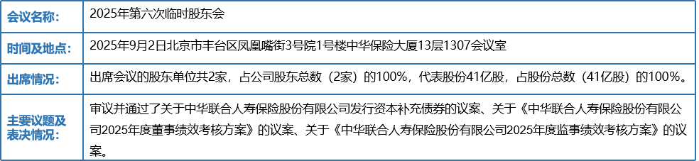 主要议题及表决情况: | 审议并通过了关于修订中华联合人寿保险股份有限公司章程的议案、关于修订中华联合人寿保险股份有限公司董事会议事规则的议案 |