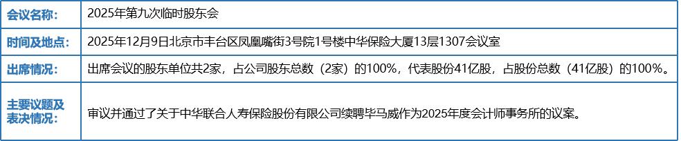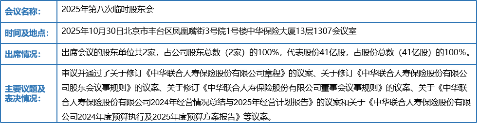 | 主要议题及表决情况: | 审议并通过了关于中华人寿2018年度董事会工作报告的议案、关于中华人寿2018年度监事会工作报告的议案、关于中华人寿2018年度董事尽职评价报告的议案、关于中华人寿2018年度独立董事尽职评价报告的议案、关于中华人寿2018年度监事尽职评价报告的议案 |